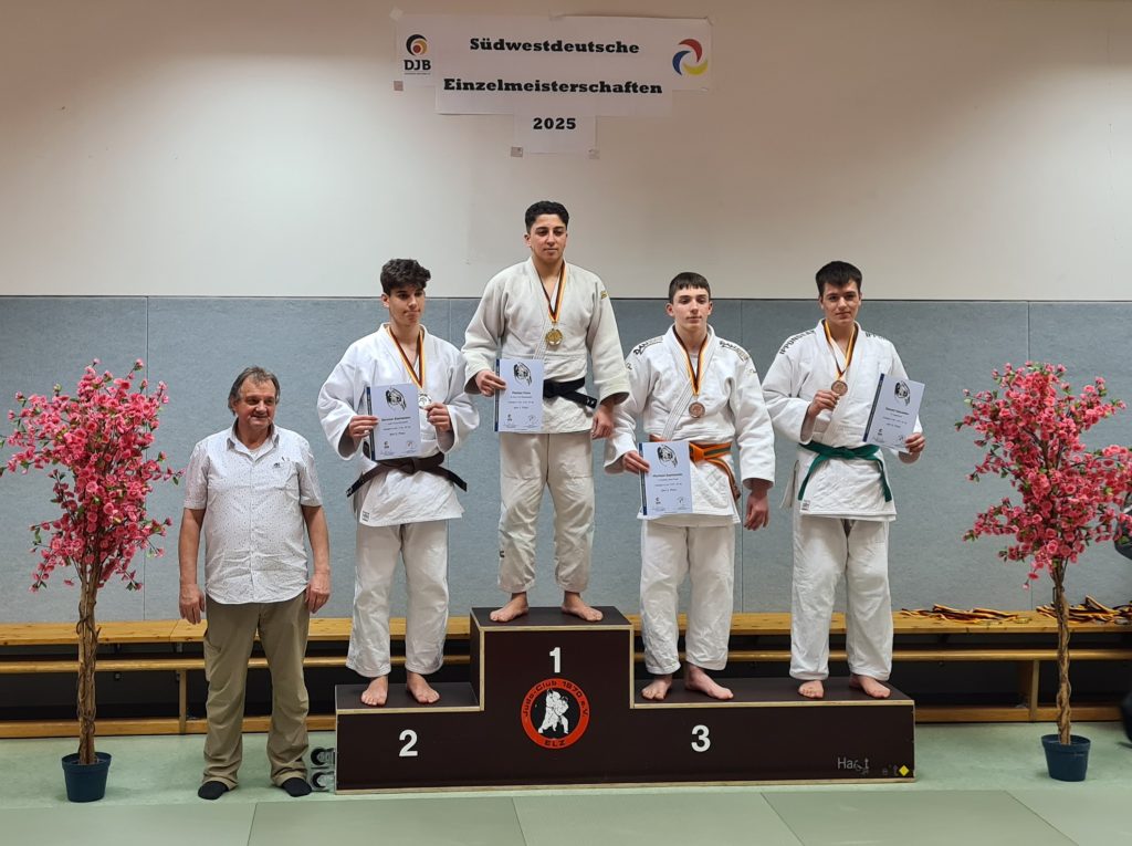 Mit 5 Startern traten die Rotweinstädter bei der Südwestdeutschen Meisterschaft in den beiden Altersklassen U15 und U18 an. Jan und Amon (beide U15) zeigten in ihren Gewichtsklassen starke Leistungen. Als Jüngster in seiner Klasse traf Jan in der Hauptrunde sowie im Kampf um Platz 3 zweimal auf den gleichen Gegner. In beide Kämpfen konnte er sich nicht durchsetzen und landete auf dem undankbaren 5. Platz. Amon sicherte sich mit drei souveränen Siegen in der Hauptrunde die Finalteilnahme. Hier traf er auf den starken Speyerer Meffle, den er nicht besiegen konnte und sich insgesamt mit der Silbermedaille belohnt. Linus, Christopher und Daniel traten bei der U18 auf die Matte, um sich mit einer Platzierung die Teilnahme an den Nationalen Titelkämpfen zu sichern. Auch qualifiziert hatte sich Florian, der aber krankheitsbedingt an der Meisterschaft nicht teilnehmen konnte und nun auf das nächste Jahr warten muss. Alle drei U18 Starter standen durch ein Freilos bereits im Viertelfinale. Dieses konnte Christopher mit seiner Wettkampfroutine sicher für sich entscheiden und musste im Halbfinale gegen den 5. Platzierten der letzten Deutschen Meisterschaft antreten. Auch wenn er sich einige Chancen erarbeitete, musste er sich der kräftemäßigen Überlegenheit des 2 Jahre älteren Speyrers beugen. Im abschließenden Kampf konnte er sich gegen den Kreuznacher Stupar leider nicht durchsetzen und musste sich mit dem undankbaren 5. Platz zufriedengeben. Auch Linus muss sich mit dem 5. Platz zufriedengeben. Nach verlorenem Auftaktkampf setzte er sich in der Trostrunde bis zum Kampf um Platz 3 mit tollen Techniken und starker Siegeswillen durch. Hier traf er auf den Cochemer Kryokhzhym, hatte das Glück dieses Mal aber nicht auf seiner Seite und verlor. Auch Daniel verlor den Auftaktkampf gegen den späteren Sieger der Meisterschaft. In der Trostrunde kämpfte er sich bis ins kleine Finale vor, das er gegen seinen Nieder-Olmer Trainingskameraden Prinz durch einen schnell ausgeführten Hüftwurf gewinnen konnte und nach 2024 mit dem 3. Platz zum zweiten Mal das Ticket für die Deutschen Meisterschaft löste.