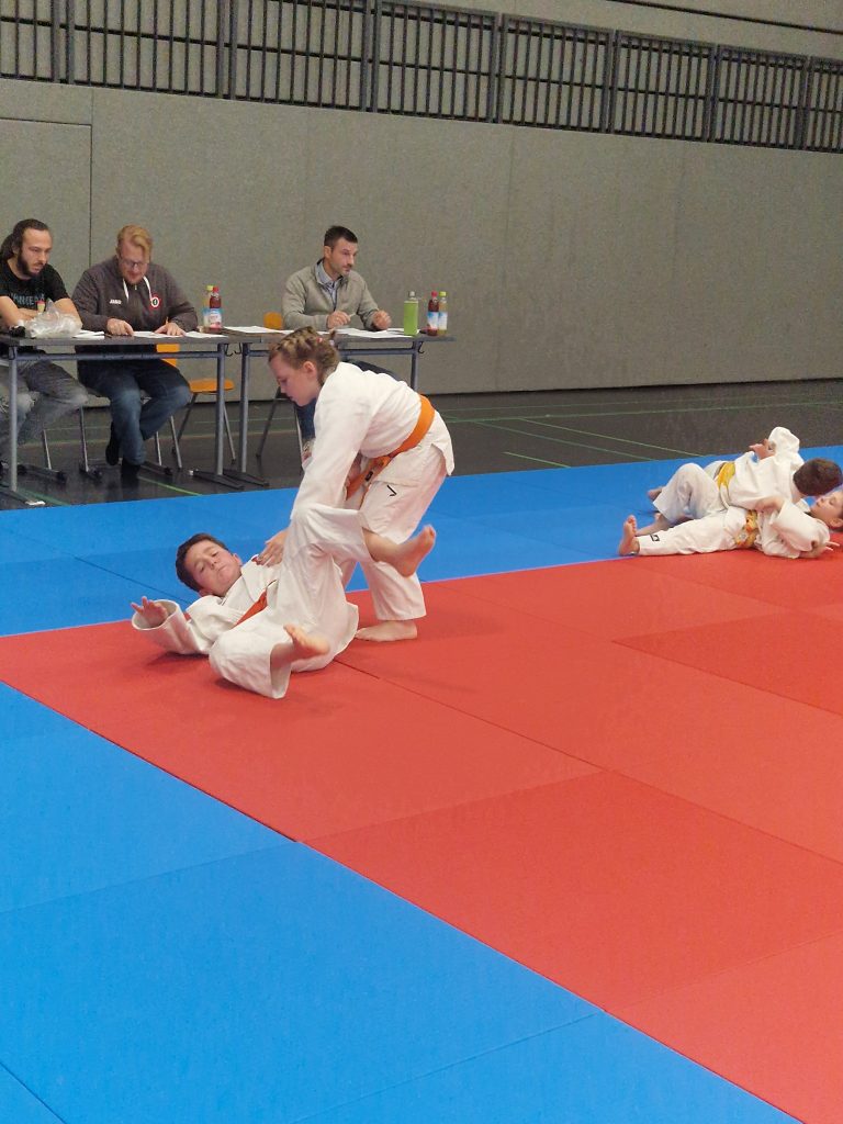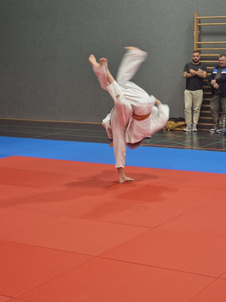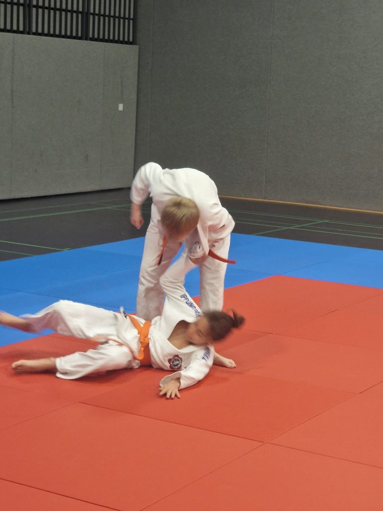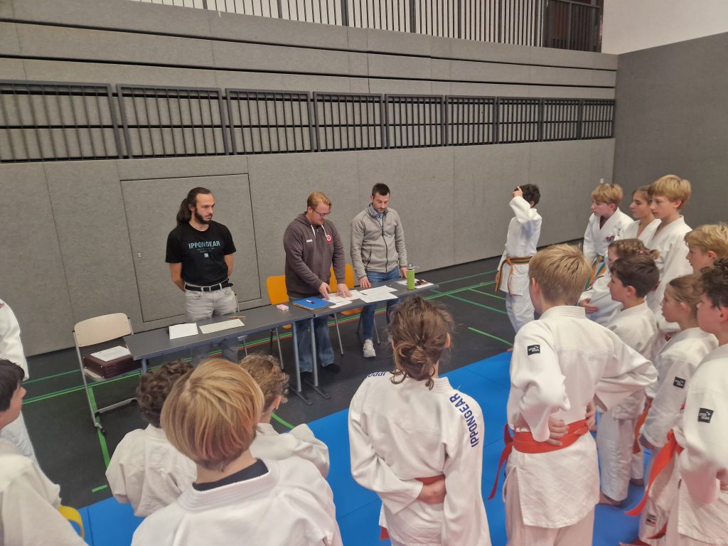 Am letzten Freitag vor den Ferien fand in der KAPRI-Sporthalle eine Kyu-Prüfung statt. 20 Kinder und Jugendliche stellten sich der Aufgabe unter den wachsamen Augen der beiden Prüfer Dr. Urs Brand und Joachim Römer. Diese ließen sich die verschiedenen Stand- und Bodentechniken für den gelb-orangen (6. Kyu), orangen (5. Kyu), orange-grünen (4. Kyu) und den grünen (3. Kyu) Gürtel zeigen, wobei der Umfang und die Schwierigkeit der Techniken in genannter Reihenfolge zunimmt. Beispielsweise werden beim orangen Kyu die einzelnen Standtechniken aus der Bewegung vorgezeigt, beim grünen Gürtel müssen die Techniken zusätzlich in Kombinationen, bestehend z.B. aus Fuß- und anschließendem Hüftwurf, ausgeführt werden. Weiterhin mussten alle Prüflinge außerdem zeigen, dass sie auch in einem Trainingswettkampf das Gelernte anwenden können und auf der Matte unter „Stress“ die Techniken sauber ausführen. Alle Prüflinge zeigten gute bis sehr gute Leistungen und haben sich den nächsten Kyu-Grad erarbeitet.